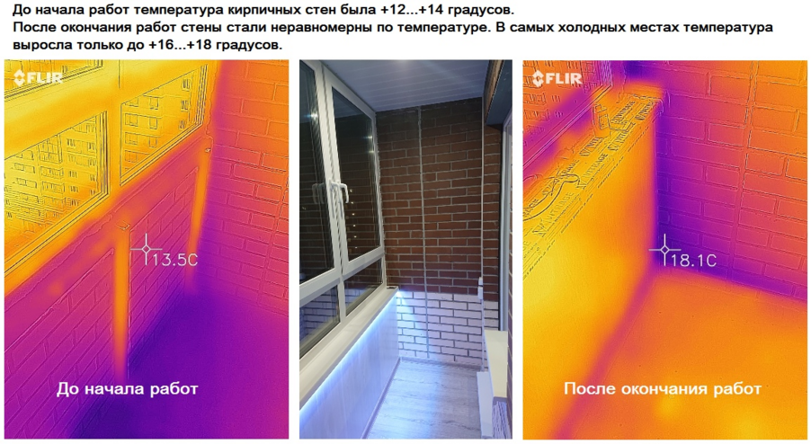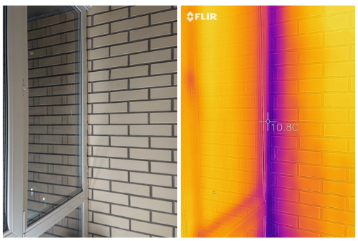 Допустим, остекление вы поменяли и настает очередь утепления балкона. Для тех кто хочет сохранить кирпичную кладку от застройщика, предлагаю внимательно на неё посмотреть через тепловизор. Зачастую там наблюдается вот такая картина: