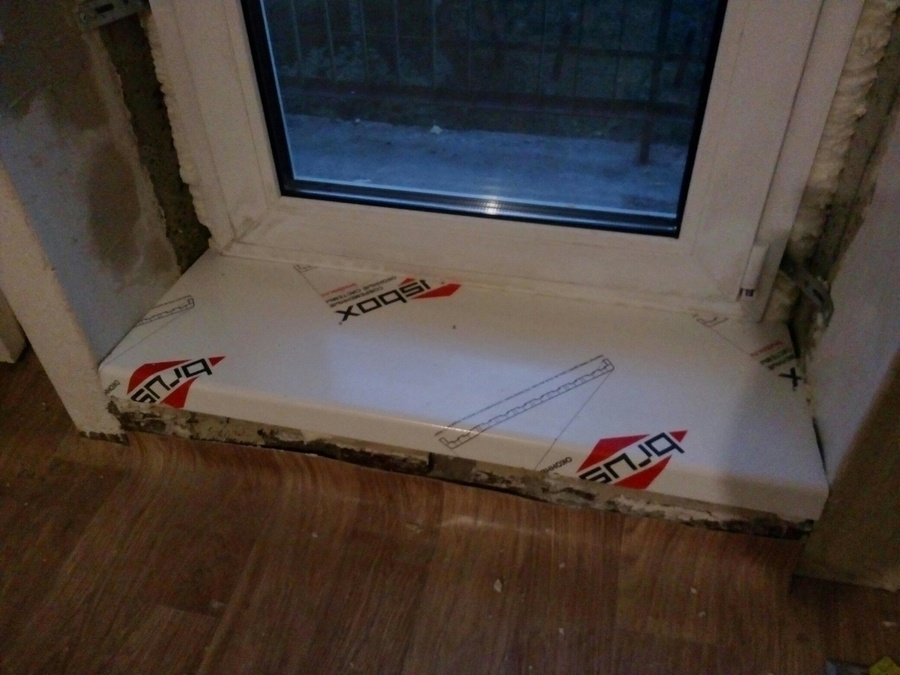 5. Устанавливаем подоконник, берем угольник или уровень и начинаем с разных концов на него аккуратно надавливать руками сверху, пока он не встанет на заранее подготовленные "пирамидки" из монтажных клиньев/подкладок. Проверяем все несколько раз. Ступенька должна стоять по уровню, быть приклеена к штукатурке и пропенена под пластиковой рамой.